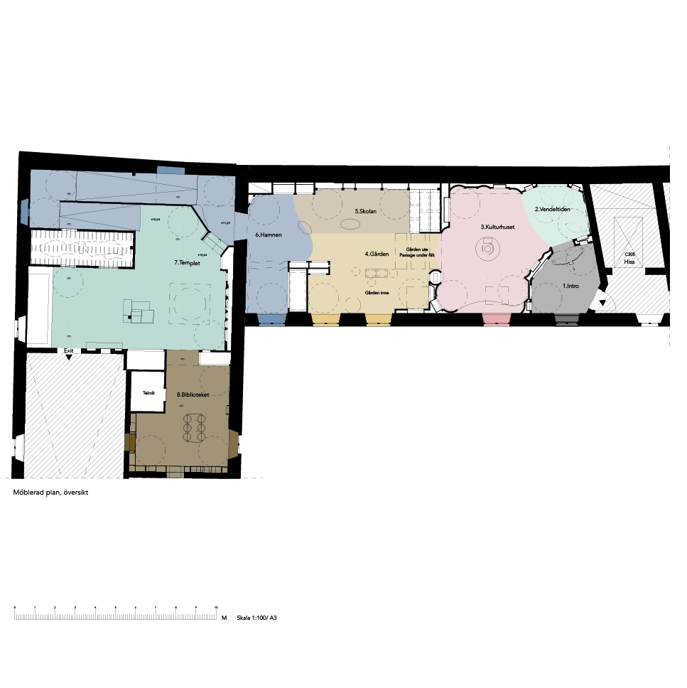 The exhibition is organised into eight thematic areas: Introduction/Ragnarök, The Vendel Period, The Culture House, The Farm, The School, The Harbour, The Temple, and The Library, each offering a different perspective on Viking Age life and legacy.
