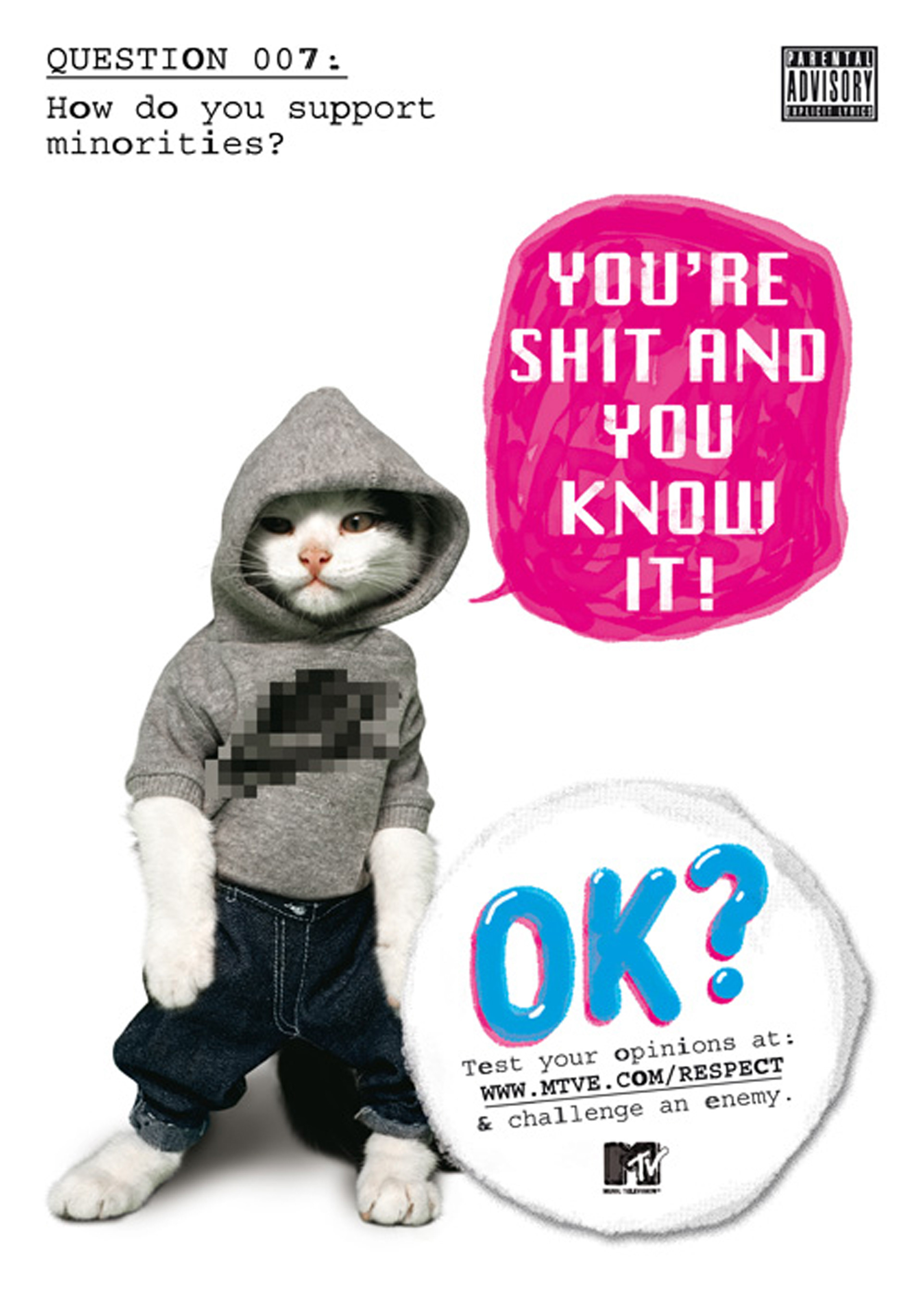 Created for MTV’s Respect campaign, these images uses humour and visual contrast to address the idea of how we treat one another. By placing animals in recognisably human situations, the images reflect on notions of respect, confrontation, and empathy.